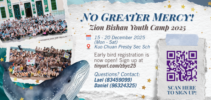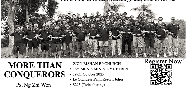 All men of Zion Bishan, please register and join us for a time to Reflect, Recharge and Rise in Christ at this year’s 16th MM Retreat. Topic: More Than ConquerorsSpeaker: Ps Ng ZhiwenDates: 19 – 21 Oct 2025Venue: ...