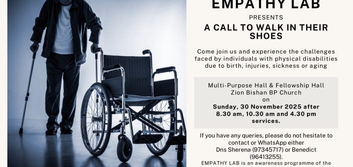 A Call to Walk in Their Shoes 30 Nov (Sun) after each of the English Services, Booths in MPH & Fellowship Hall Come experience the challenges faced by individuals with physical disabilities due to birth, injuries,...