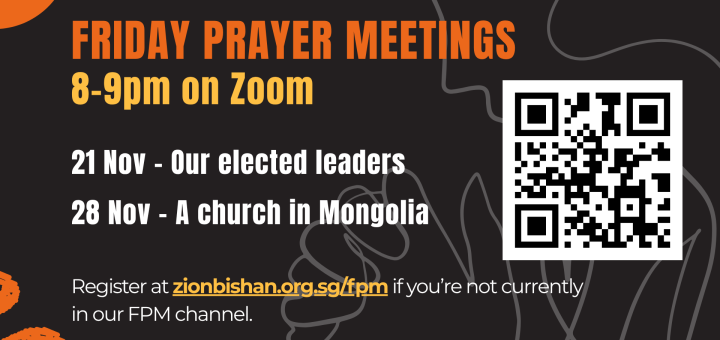 21 Nov – Come and pray for our elected leaders28 Nov – Come and catch a glimpse of our partner church in Mongolia and pray for the challenges they face 8pm over Zoom Register at zionbishan.org.sg/fpm if you’re...